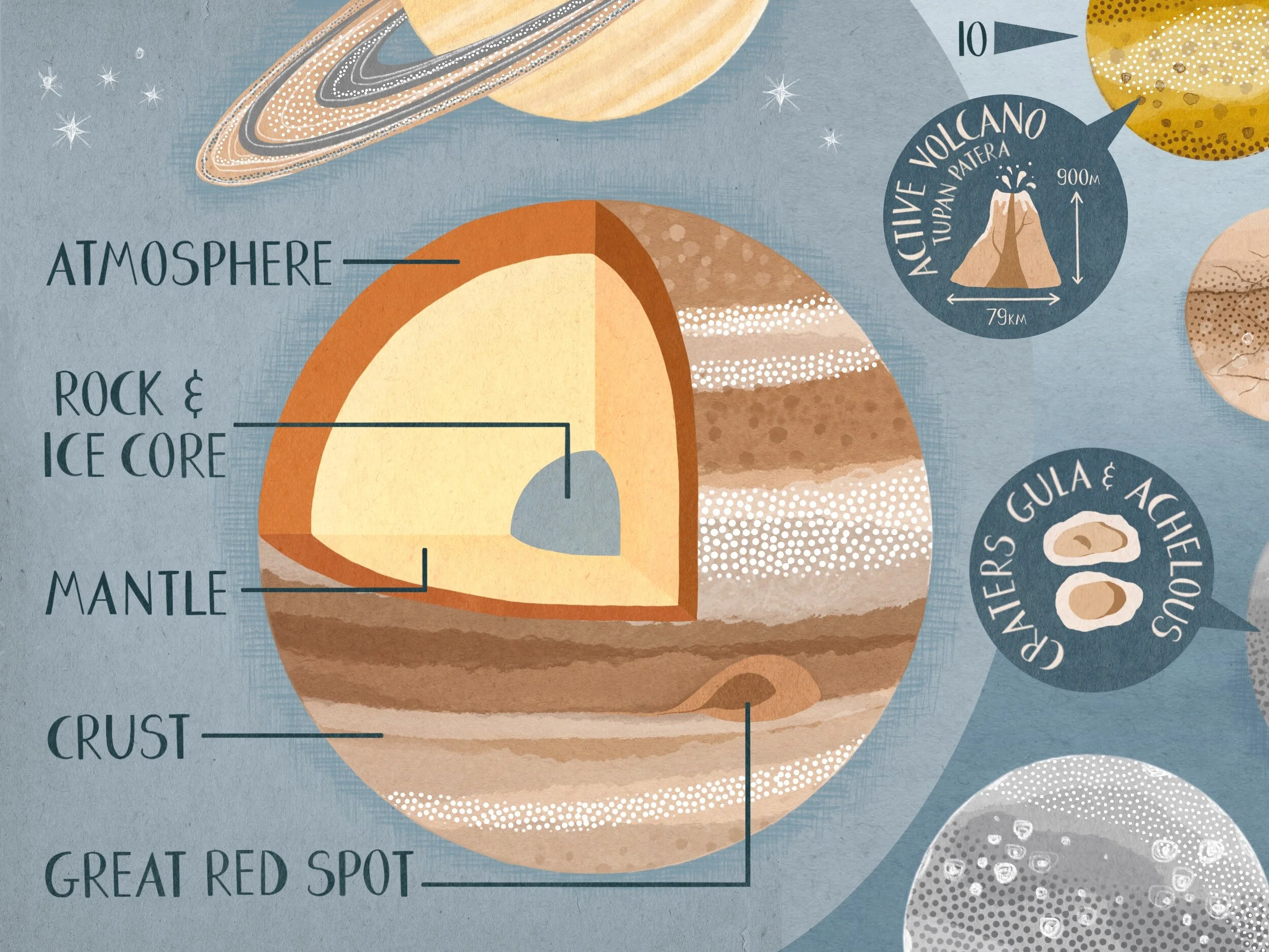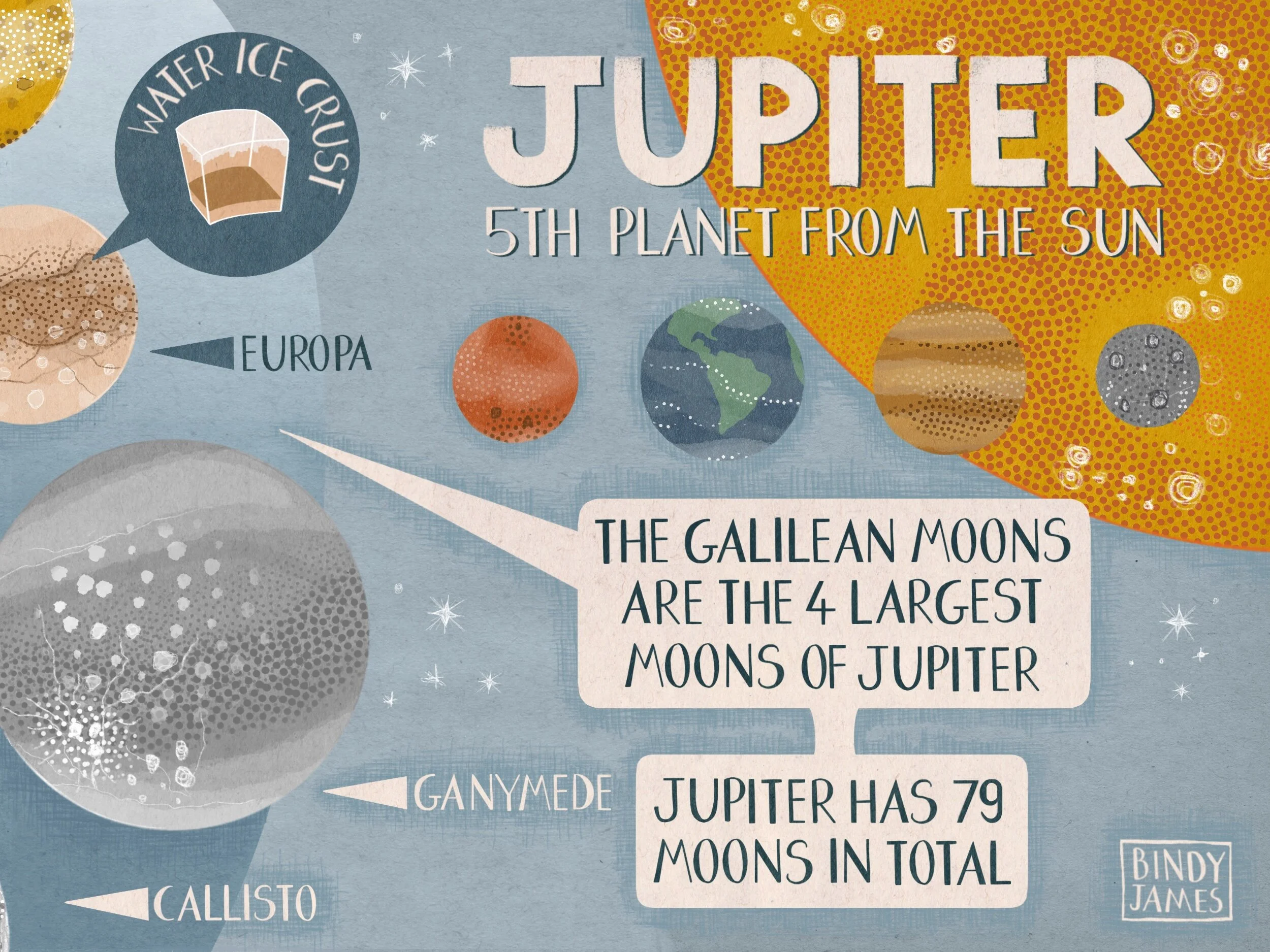 An illustrated infographic about Jupiter and it’s Galilean moons for the book 100 Illustrated Maps from Outer Space! Curated by They Draw and Travel.