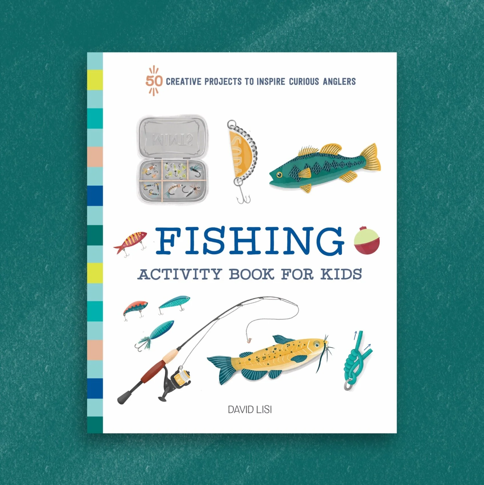 Cover illustration for Fishing Logbook for Kids Observe and Record your Catches. Author David Lisi. Book design Jane Archer. Published by Rockridge Press.